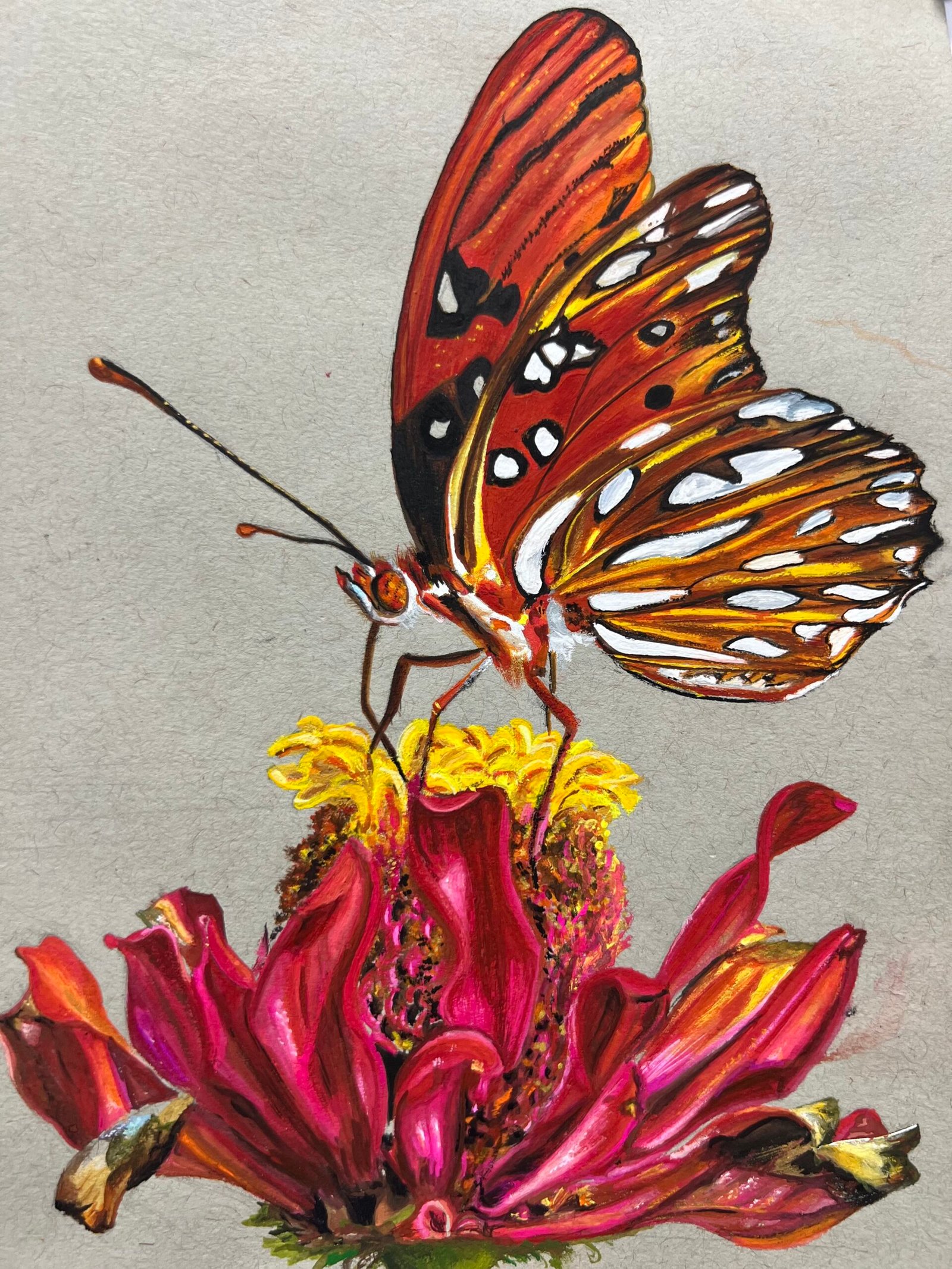 A vibrant nature-inspired painting featuring a detailed butterfly resting on a blooming flower, symbolizing transformation and beauty.